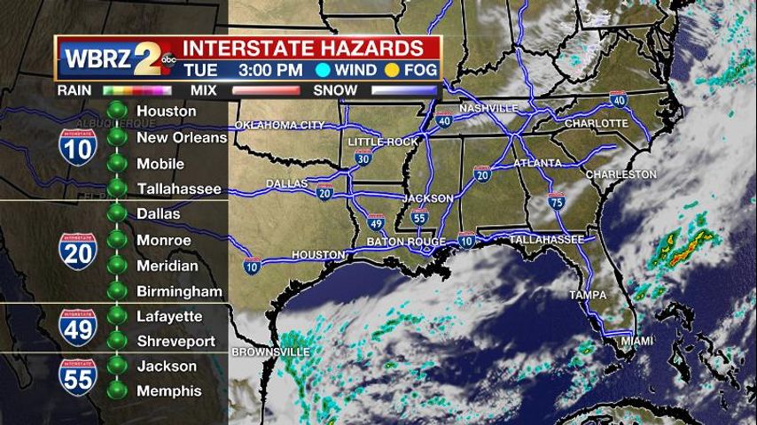 Up Next: The next few weather makers are nondescript and these weaker systems can be a little trickier to forecast. At this time, it appears that travel day (Wednesday) should be clear locally and around much of the country with exceptions in the Great Lakes and Pacific Northwest regions. Drivers may find a few light showers along I-10 West through Houston and Eastern Texas late Wednesday.