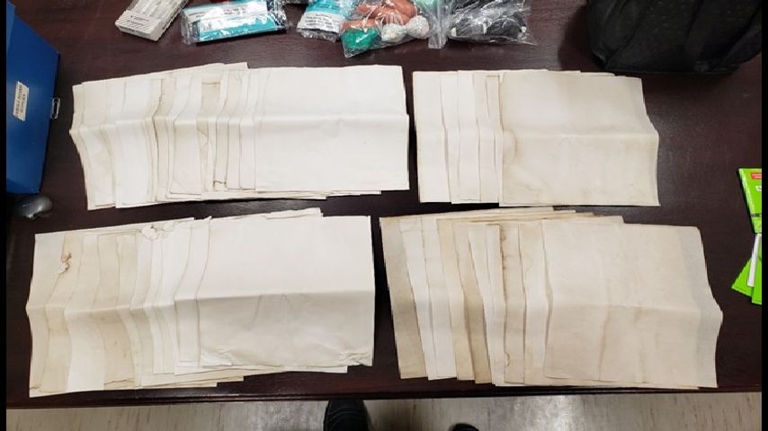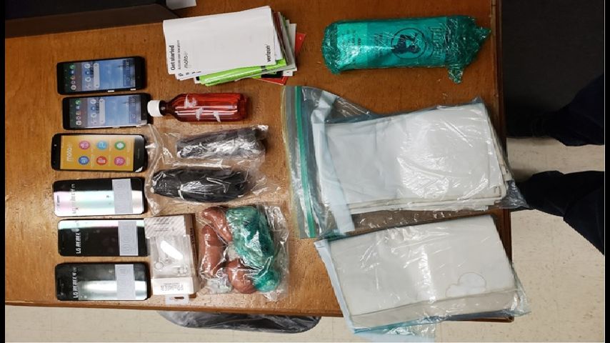 Inside the bag, investigators found six cellphones, 45 pages of loose-leaf paper sprayed with a substance suspected to be synthetic cannabinoid enclosed in clear bags, a four-ounce bottle of a liquid substance suspected of being cough syrup with codeine, 250 pills suspected to be MDMA (ecstasy), three packs of tobacco, 42 Nugenix Total-T testosterone pills, five taped bundles of suspected illicit substances containing 200 grams, and 26 cell phone manuals with activation packages. Ruiz also had two cigars in her pants pocket, authorities report.