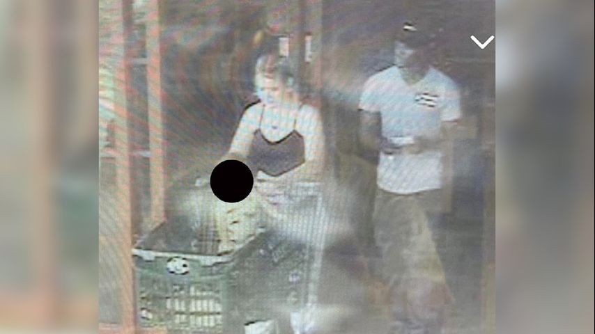 A security photo provided to help identify the shoplifters shows a child inside the couple's cart.
