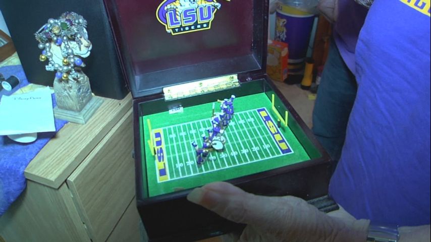 Every inch of their Baton Rouge home is filled with at least one thousand LSU items ranging from tiger shoes, tiger cookware, and a rare music box that plays the tiger fight song with a miniature LSU Band.