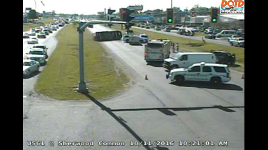 Both lanes of Airline Highway southbound were closed at Sherwood Commons. A turn lane on Airline northbound was blocked and traffic was slowing as people driving by looked at the situation.