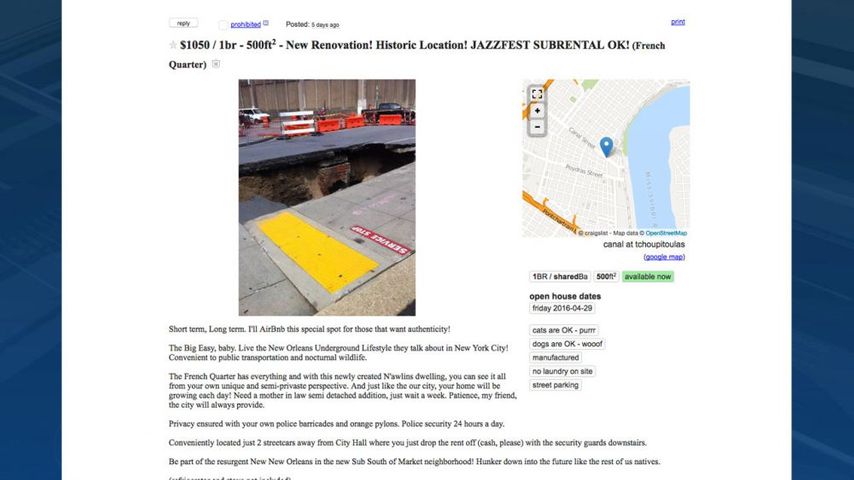NEW ORLEANS - With rents around the country through the roof, a Craigslist New Orleans user has decided to have a bit of fun by posting a listing for Canal Street’s recently opened sinkhole.