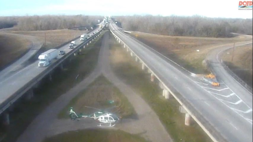 Louisiana State Police says an 18-wheeler and another vehicle crashed, sending the 18-wheeler over the railing at the Whiskey Bay exit. The driver of the big rig was transported by Air Med to a local hospital in critical condition.