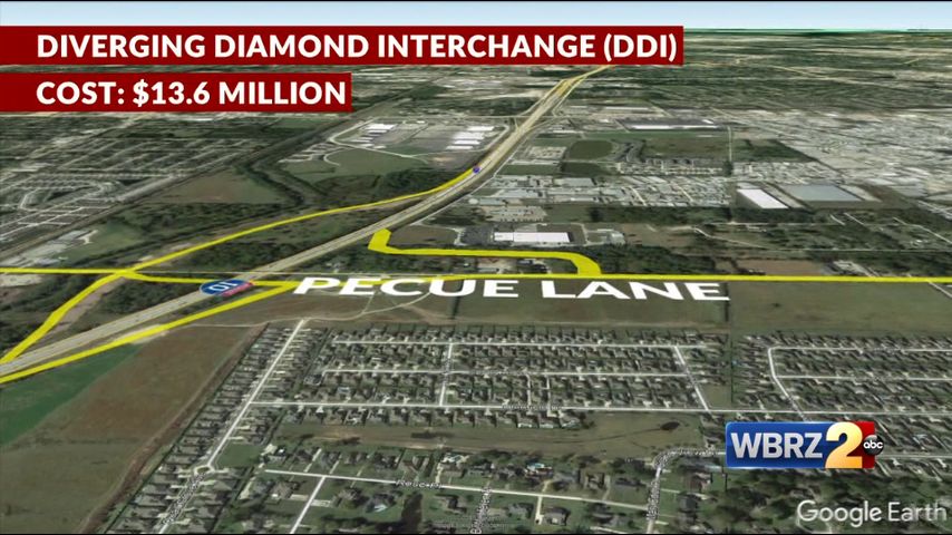 Once the $13.6 million project is complete, drivers will be able to exit from I-10 to Pecue via a diverging diamond -- the first of its kind in the state.