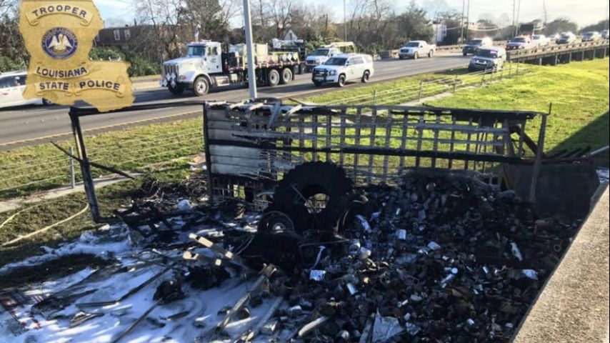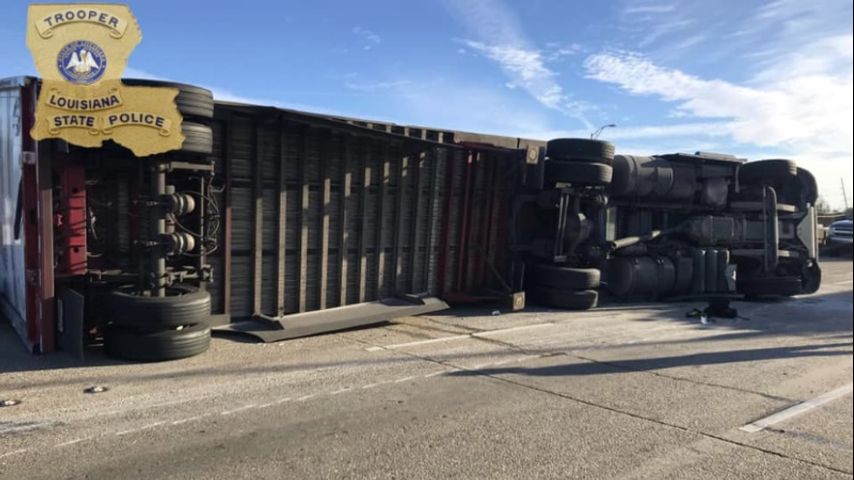 According to WWL-TV, state police believe the crash was a hit-and-run because a silver Mercury Grand Marquis is believed to have sideswiped an 18-wheeler causing the crash. Authorities say the truck driver lost control, causing the 18-wheeler to flip on its side. The truck's second trailer then fell over a bridge railing landing on a grassy area below.