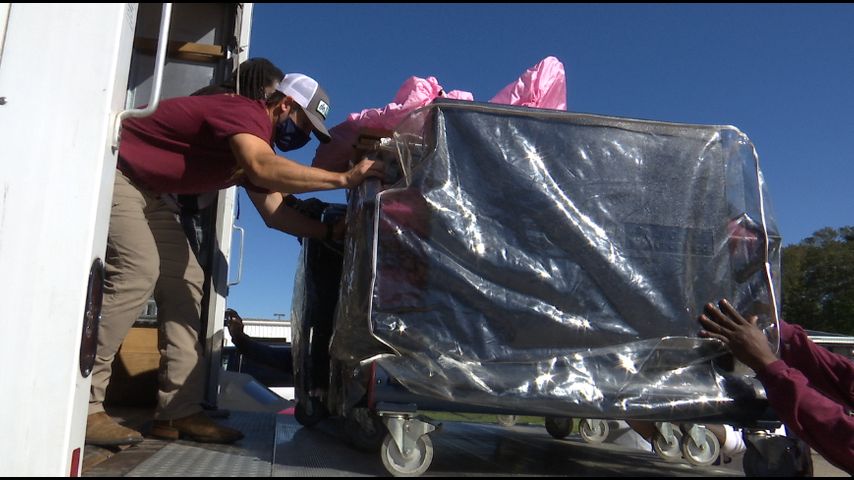 There is more to pack along with the machines. A bag of PPE and hand sanitizer dispensers are also being packed into trucks.