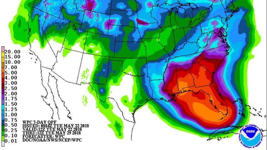 A weak area of low pressure will break by midweek, but at the same time, a disturbance will likely develop near the Yucatan Peninsula. This will stream moisture northward as a trough over the northeastern Gulf of Mexico gradually deepens. Forecast focus will turn to the disturbance moving out of the northwest Caribbean Sea and into the southern Gulf of Mexico. Models remain in disagreement as to the evolution of this system beyond that point. The GFS model captured this idea first and continued to push a weak surface low east toward Florida over the weekend. The ECMWF model was late to the party but has trended further west and toward Louisiana with a surface low. If this scenario is correct, heavy rain could be a threat for the Memorial Day Weekend. Even if tropical development does not occur, this system will likely bring much higher rain chances than what occurred during the first half of the month. Weather Prediction Center 1-7 Day forecast totals of 3-6 inches would be manageable but isolated higher amounts could become problematic. Through the week, we should better be able to target where these heaviest totals could occur. As afternoon convection gets more active, high temperatures are often held in check, topping out in the upper 80s and low 90s instead of the mid 90s.