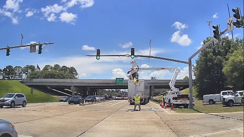DENHAM SPRINGS - Dashcam video from a driver in Livingston Parish showed the moment an electrical worker was hit by the top of an 18-wheeler passing under the traffic signal.