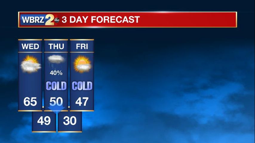 Up Next: Off and on showers will continue into Thursday before a strong cold front brings very cold temperatures into Southeast Louisiana and Southwest Mississippi by early Friday Morning. It will be the coldest air mass so far this season, and some areas north of I-12 will experience temperatures in the upper 20s. The cold Canadian air will only allow daytime highs on Friday to reach the middle to upper 40s! Be prepared to pull out the heavier sweaters and jackets to combat the bone-chilling temperatures.
