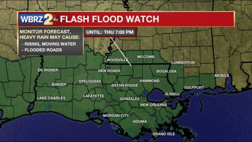 A large plume of deep tropical moisture has been forced over the region from a deepening trough of low pressure to the northwest, a ridge of high pressure in the eastern Gulf of Mexico and the remnants of a tropical disturbance that is now a trough of low pressure sitting off the eastern coast of Mexico. These three systems are acting as a conveyor belt and funneling copious amounts of deep tropical moisture over the entire region and has placed the area in a moderate risk for Excessive Rain today and tomorrow. The potential for heavy rain exists and the National Weather Service has issued a Flash Flood Watch for our area in effect for late Wednesday night into Thursday evening. These storms could produce locally heavy rainfall rates at two to three inches per hour, and this could result in flash flooding across the area on Thursday and possibly into Friday. Waves of showers and thunderstorms will be tracking out of the Gulf of Mexico for the next 48 hours and rain chances will remain at or near 100% through Friday evening.