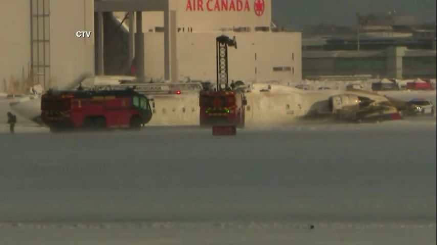 Video from the scene shows the Mitsubishi CRJ-900LR upside down on the snowy tarmac as emergency workers hose it down. The plane was somewhat obscured by snow from a winter storm that hit Toronto over the weekend.
