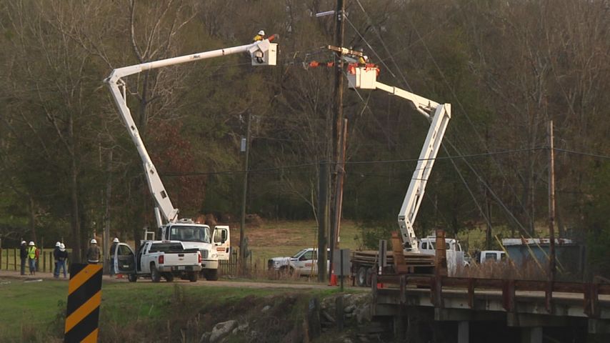 ST. FRANCISVILLE- Work crews lined both sides of State Highway 66 near Bayou Sara Wednesday evening repairing broken power lines strung through dense forests. It's the third day of repairs from Monday's windstorm that at one point left tens of thousands in the dark.
