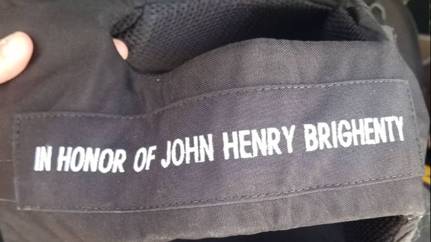 The vest was sponsored by Jessica Brighenty, Julie Brighenty-Fitzgerald, and friends. On the side, it reads, “In honor of John Henry Brighenty.”