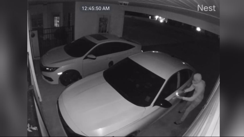 Surveillance from a home's carport security camera shows one of the suspects allegedly sneaking up to break into a vehicle.