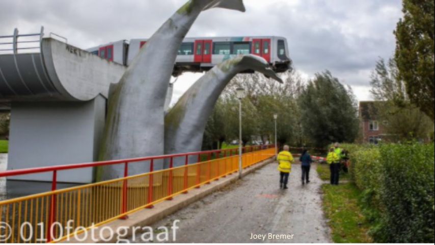 The seemingly unstoppable train apparently burst through the buffers at the station, which is at the southernmost end of the Rotterdam metro system, and would have crashed more than 30 feet to the ground had it not landed on one of two whale tails installed by architect Maarten Struijs almost 20 years ago, CNN reports.