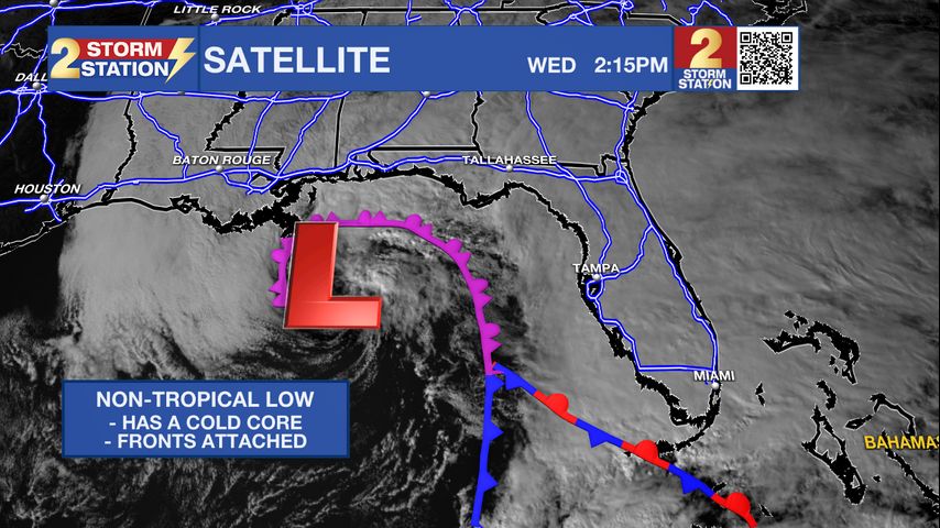 The Storm Station has received a few questions regarding a well-defined circulation on satellite imagery located southeast of the Mouth of the Mississippi River. Although it may have a concerning appearance, this circulation is not and will not become a tropical cyclone. Rather, it is a low-pressure system known as an extratropical cyclone. These are very common.