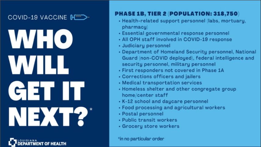 At Governor John Bel Edwards' order, Monday, Jan. 4 marks the first day that inoculation efforts will expand to include individuals who are 70 years of age and older as well as ambulatory and outpatient healthcare workers.