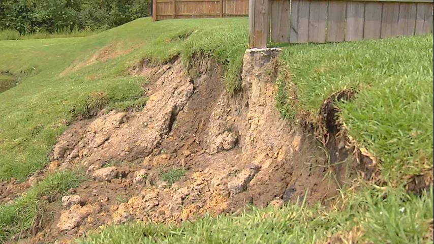 The land just behind Langlois fence has slumped into the detention pond behind the house. It happened overnight Friday, September 7, after a hard rain. Right now, it's only affecting a couple of homeowners, but residents fear it could get worse. Dollar signs are flashing in front of Langlois' eyes.