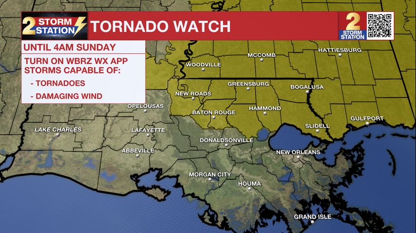 The National Weather Service has issued a tornado watch for East Baton Rouge, West Baton Rouge, Pointe Coupee, East Feliciana, Livingston, St. Helena, Tangipahoa, and West Feliciana Parishes as well as, Amite, Pike and Wilkinson Counties until 4 AM.