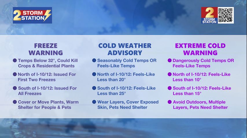 The FREEZE WARNING will be restored to its original purpose as an agricultural product based on two zones within the Storm Station Forecast Area. For southwest Mississippi and neighboring Louisiana Parishes, a FREEZE WARNING will be triggered the first two times that temperatures dip below 32 degrees. Since the first two instances are considered a “killing” freeze, it will not be issued again unless there has been a prolonged warm spell and growing has resumed. Along and south of the Interstate 10/12 Corridor, the FREEZE WARNING will be issued every time temperatures are expected to dip below 32 degrees.
