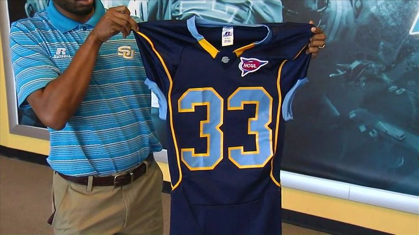 In a press conference on Thursday afternoon, Interim Athletic Director Roman Banks reiterated the university's thanks to the University of Georgia for their support of Gales in his time of need. Banks also unveiled a special navy SU football jersey, bearing Gales' No. 33, that will be sent to the young man during his recovery. The navy jersey was already planned to be paired with navy pants for the Jags' upcoming Homecoming game, but it will now serve the dual purpose of commemorating the squad's injured player.
