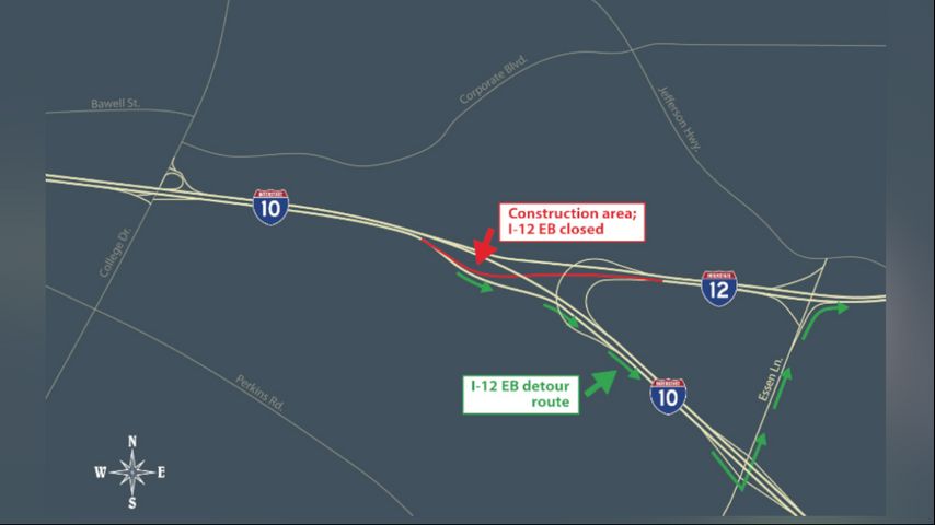 During the closure, traffic on I-10 East heading for I-12 East will have to use the Essen Lane exit and then turn left onto the ramp for I-12 East.