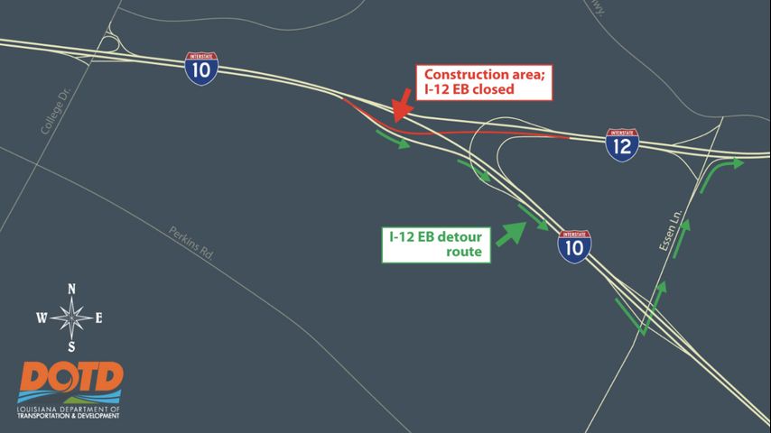 Drivers will have to continue on I-10 eastbound and exit at Essen Lane, make a left turn and continue to the I-12 eastbound ramp to bypass the segment closed for construction.