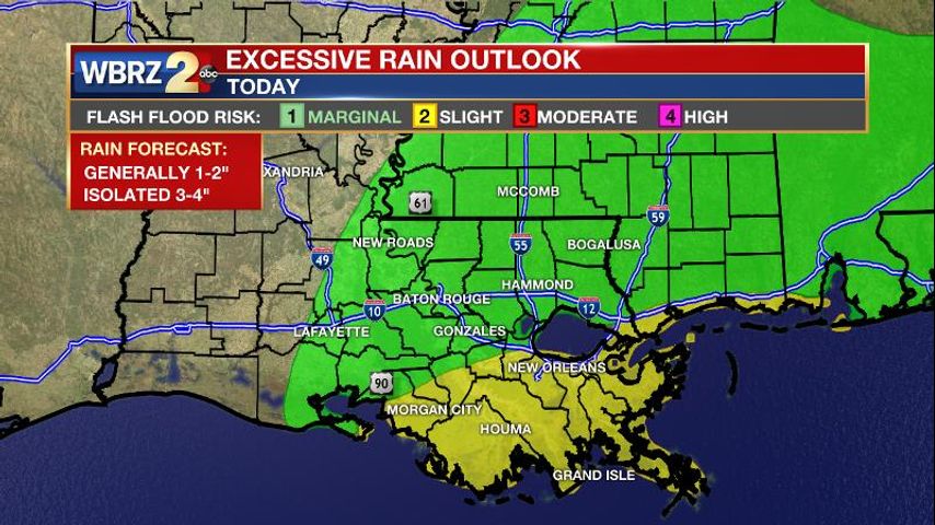 Like the weekend, scattered to widespread thunderstorms will be possible across the area. The National Weather Service Weather Prediction Center has issued an outlook for excessive rainfall in parts of southeast Louisiana and southwest Mississippi. The greatest threat for street and poor drainage flooding will be along the coast.