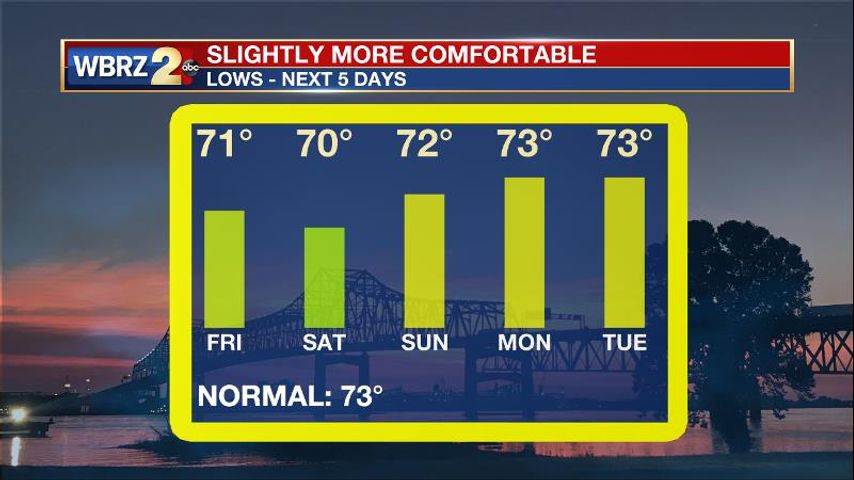 Today and Tonight: In the wake of a weak cold front, there may be some lingering moisture for areas south and west of Baton Rouge, which would be the only locations that could receive a shower on Thursday. Otherwise, expect mostly sunny skies with high temperatures in the low 90s. A touch lower humidity may be noticed, but more sensible changes will be felt overnight with low temperatures in the low 70s.