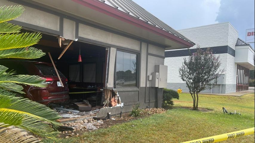 Video of the aftermath shows a red vehicle fully inside the restaurant, with the wall and windows around it demolished.