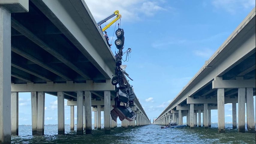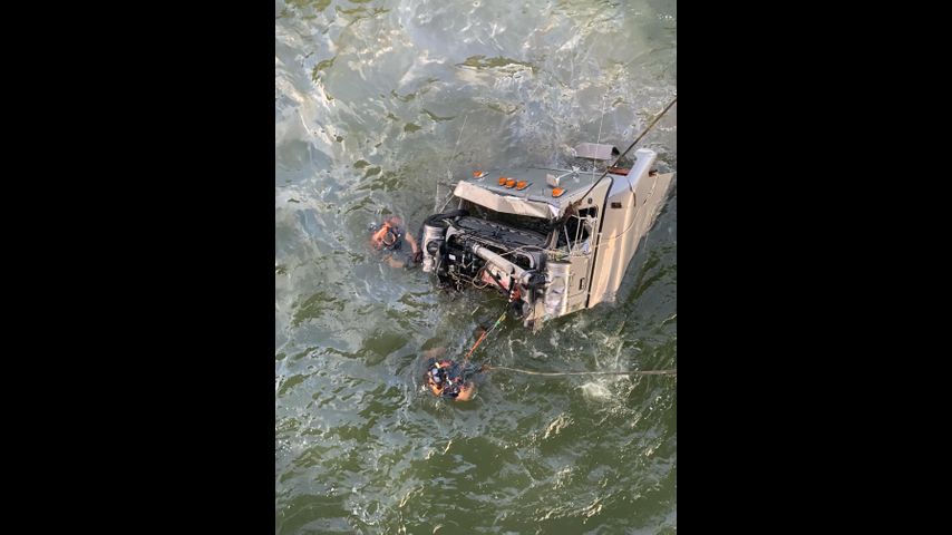 The cab of the 18-wheeler went off the bridge and into the water below, according to the sheriff's office. Marine deputies rescued the driver from the water and brought him to land where he was treated for minor injuries.