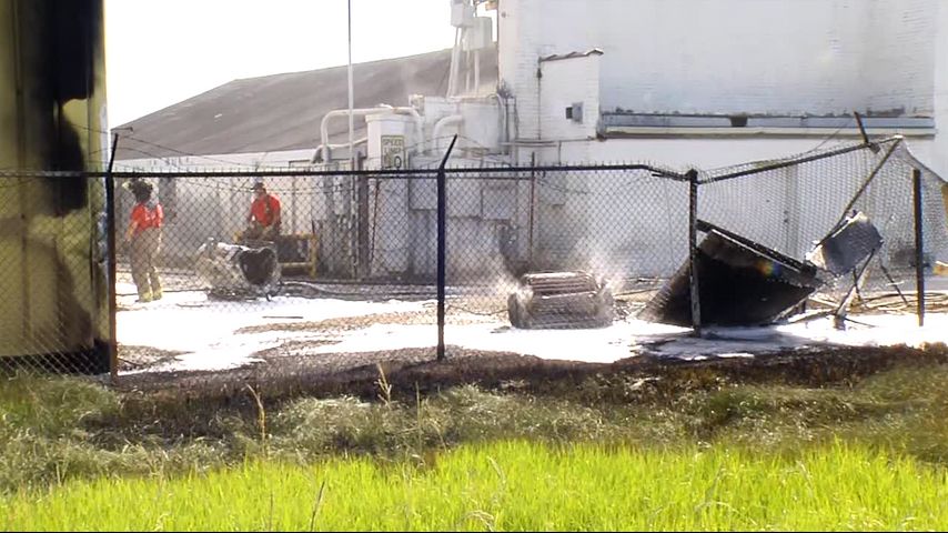 The truck crashed through a fence and struck a transformer, causing it to burst into flames. Oil from the transformer caught fire and spread to a nearby building, causing major damage.