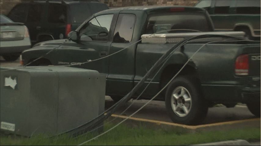 Several vehicles in an apartment complex are trapped by power lines draped across them.
