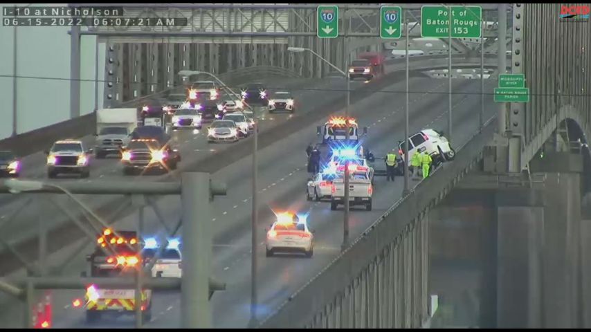 Traffic cameras showed a van propped up against the railing after a wreck on I-10 around 5:30 a.m. Wednesday. Workers closed off I-10 West at the bridge for roughly an hour to clear the wreck, which reportedly involved at least one other vehicle.