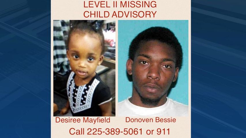 Donoven Bessie, 23, was arrested after he was found hiding in the trunk of a vehicle at a hotel near I-12 and Airline. Bessie was at the hotel with his girlfriend and her son when police noticed a suspicious vehicle and upon inspection located Bessie's missing 22-month-old in the back seat. Later, Bessie was located in the trunk.