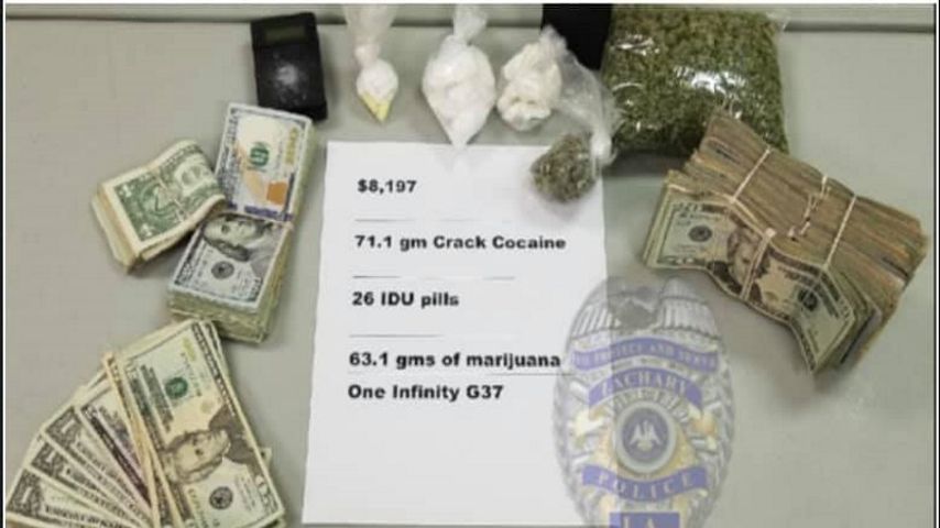 After a quick search, K-9 Spike found a black bag under the hood of the vehicle containing approximately 71 grams of crack cocaine and cocaine. Officers also found Marijuana, an assortment of pills, as well as a digital scale.
