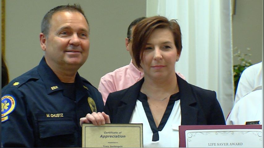 EMS and the Central Fire Department gave young Taylor Santangelo and her aunt, Tracy Santangelo, a citizen award for their quick action when Taylor's mom suffered a heart attack.