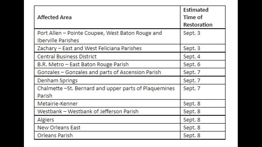 The timetable gave Gonzales and Denham Springs an estimated restoration time of September 7.