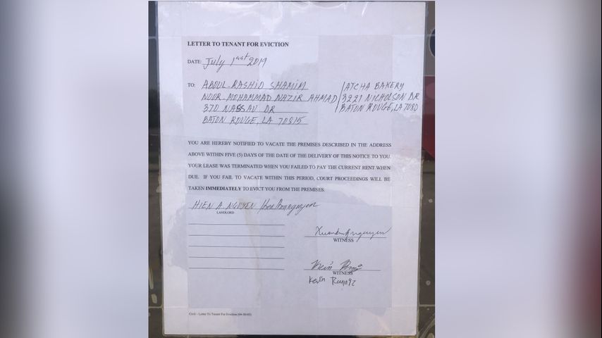 Eviction notice posted at Atcha Bakery & Cafe near LSU