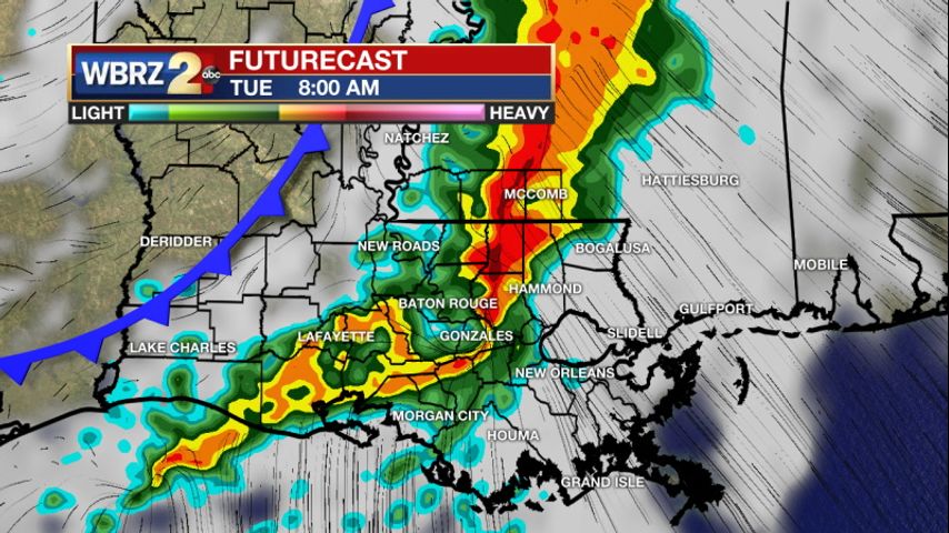 We will likely have some dry time on Tuesday afternoon before the showers pick back up again on Wednesday. A warm front will be the rainmaker on Wednesday. Warm fronts tend to be slow-moving and will prolong rain over the area. For Wednesday, parts of the area are under a MARGINAL (1/5) risk for excessive rainfall, areas south and east of Baton Rouge are under a SLIGHT (2/5) risk. Again, this means that heavy downpours may cause isolated flooding events in the highlighted regions.
