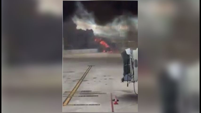 Thick clouds of smoke can be seen near the runway.