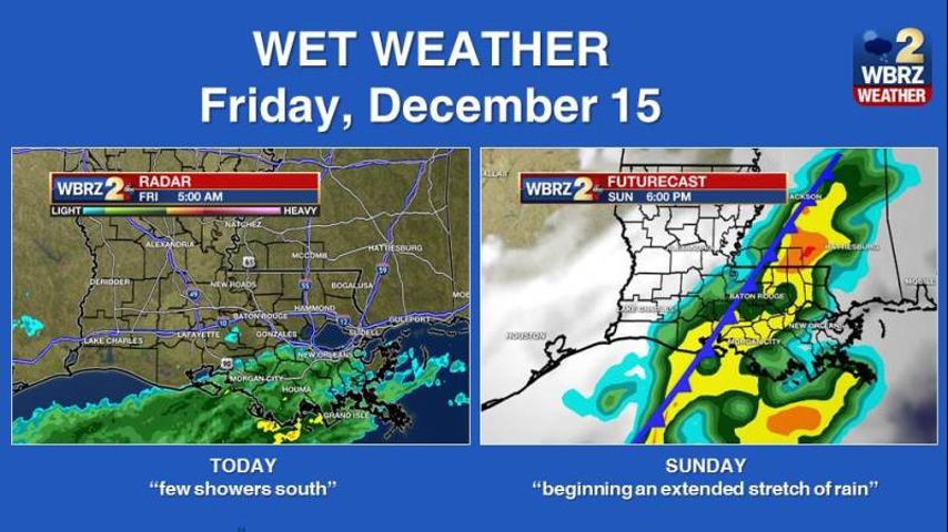 Up Next: After a chilly start, Saturday will be seasonable with occasional peeks of sun. Highs will push 70 degrees by Sunday but rain and thunder are likely. A washout is possible and some locations may get a healthy soak of up to an inch. It now looks as though showers and thunderstorms may carry into Tuesday or Wednesday of next week before a break. Long-term trends suggest that temperatures will moderate by next weekend. Leading into Christmas, a stormy pattern may unfold with widespread rain across the Eastern United States. Forecast models have been steadily suggesting that a cold front will pull temperatures back down just in time for the holiday. For many, that could be considered an improvement in the Baton Rouge area over record warmth from the previous years.