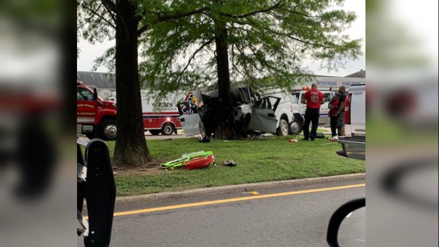 BATON ROUGE- A fiery, single-vehicle crash leaves two people critically injured Wednesday afternoon on Sherwood Forest Boulevard.