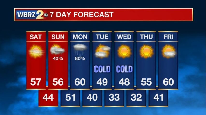 Early Saturday morning we'll slip to 44, only expecting the daytime high to be 56 degrees by 1:00 p.m. Some partial warmth is expected, only due to the return of sunshine after three days. However, a return of cloud cover is expect late in the afternoon and into the evening hours.