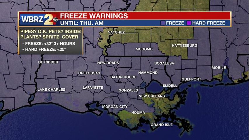 A ***FREEZE WARNING*** is in effect from late Wednesday night through Thursday morning. This means temperatures will drop to 32 degrees or lower for 6 to 8 hours over southwest Mississippi and 3 to 6 hours in southeast Louisiana. Sensitive vegetation could be damaged. Wind chill values in the 20s will impact people and pets outside for prolonged periods, so please be sure they have access to warmth. Pipe bursting is not typically a concern until temperatures go below 25 degrees but you may use this as a reminder to wrap now ahead of possible colder times this winter.