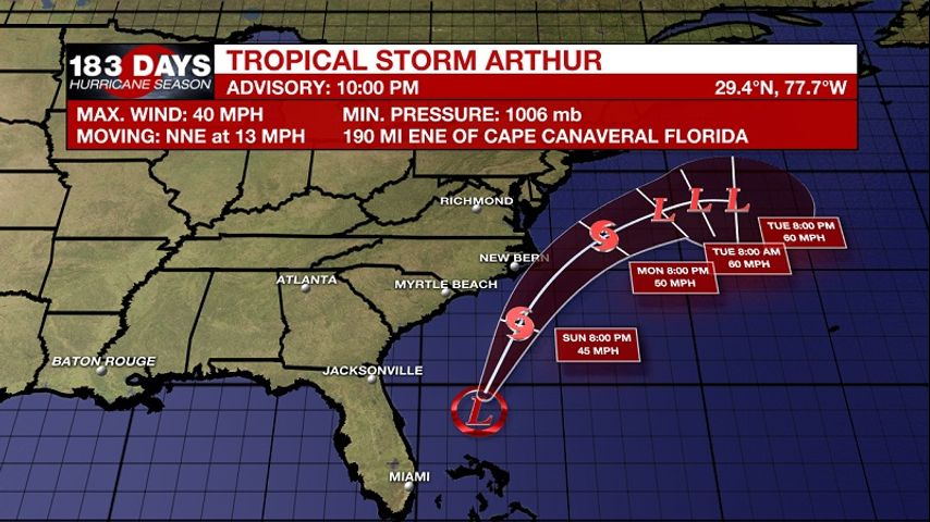 The first named storm of the 2020 hurricane season has formed north of the Bahamas. Squalls of heavy rain and gusty wind are anticipated over eastern Florida and the Bahamas through the end of the weekend as the storm pushes off to the northeast. By Monday, the outer banks could begin to feel the effects of Tropical Storm Arthur, where a tropical storm watch has been issued. This system poses no threat to the Gulf Coast.