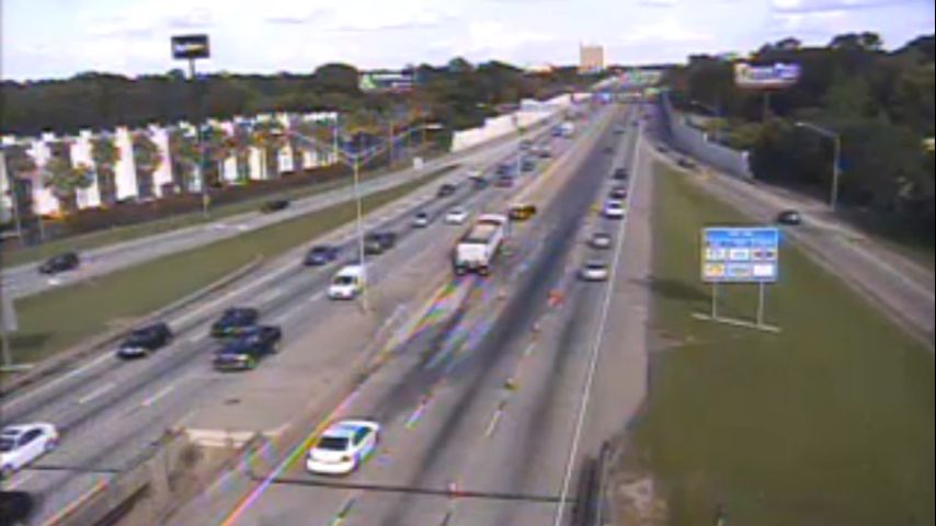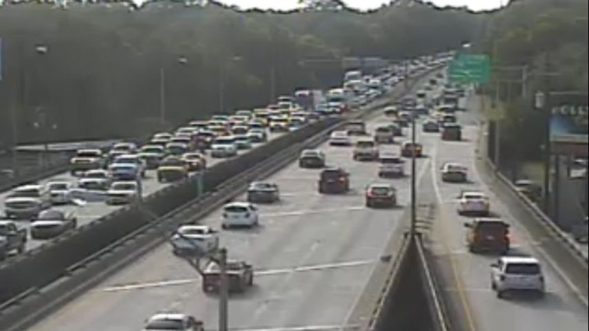 The left and center lanes were blocked at the site of the wreck. Traffic was still passing through in the right-hand lane.