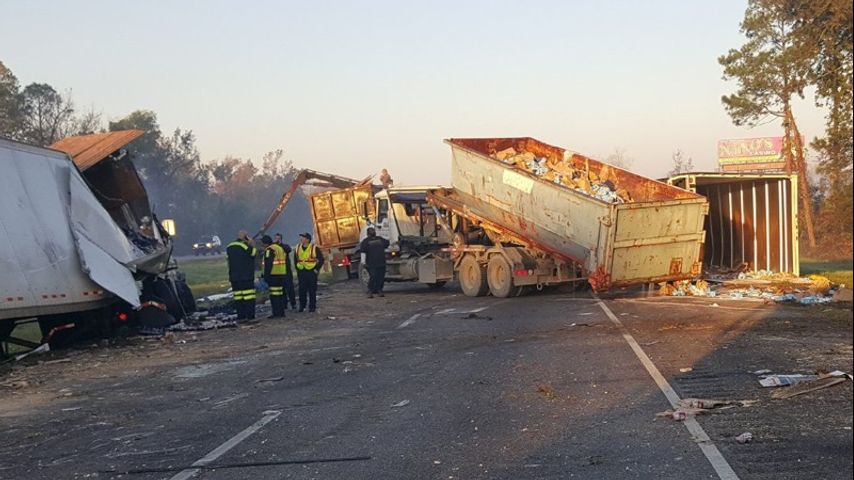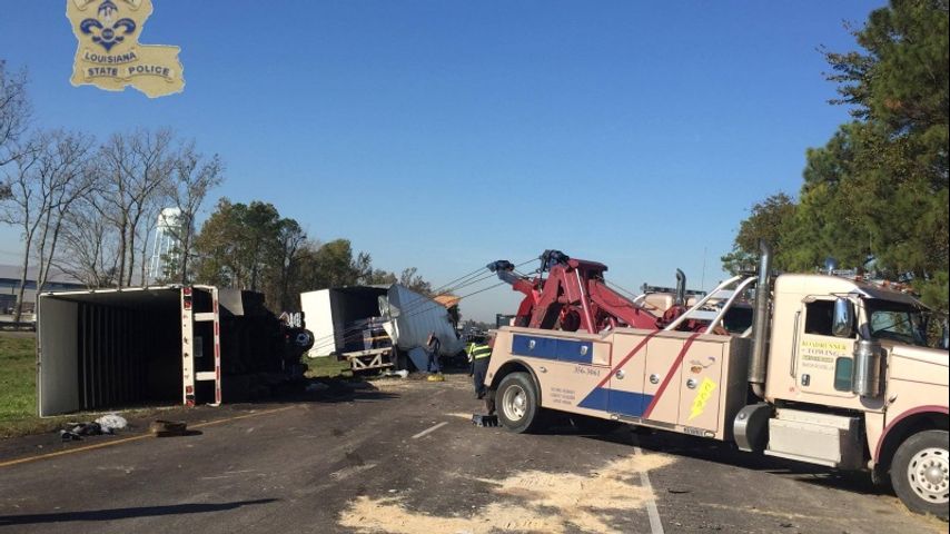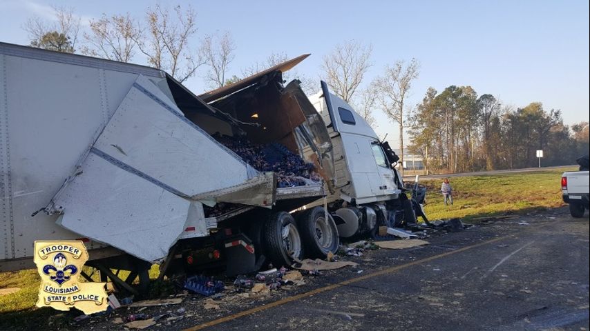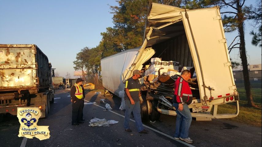 Pictures taken by Louisiana State Police showed wreckage strewn across I-10 West mid-morning. Two of the trucks were hauling soda and alcohol, which had spilled across the interstate.