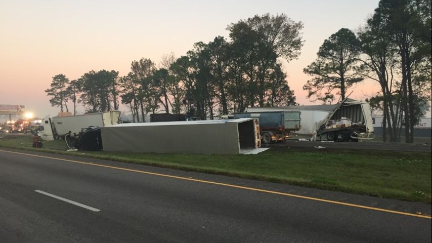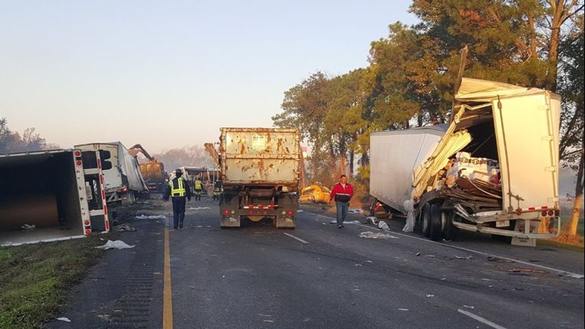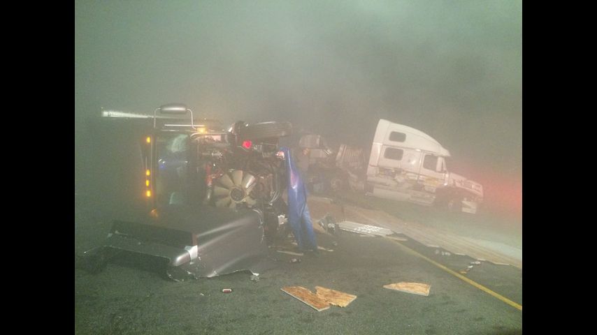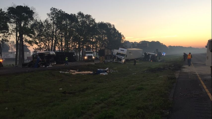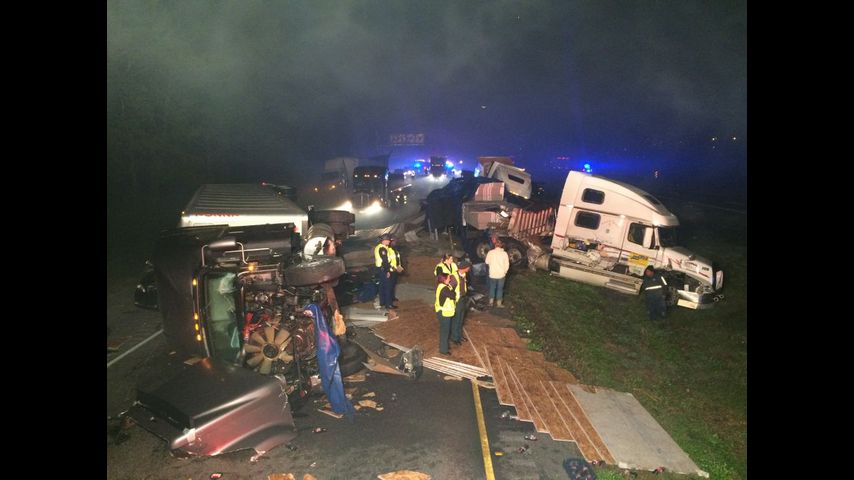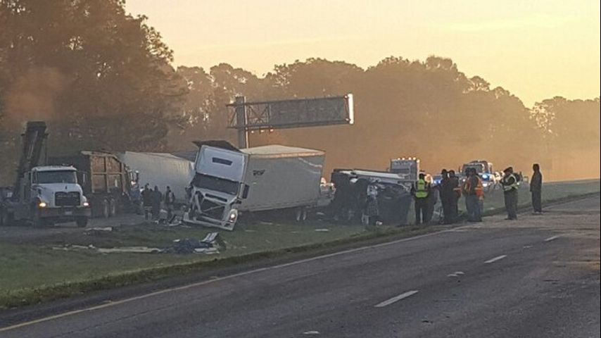 Investigators said a woman stopped in the middle of I-10 and got out of her vehicle, possibly because she thought something hit her vehicle. An 18-wheeler driving through the area then hit her car, which in turn was hit by five other big rigs in the foggy and dark conditions.