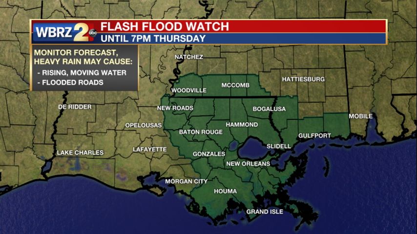A Flash Flood Watch means there is a potential for flash flooding based on current forecasts. Monitor later forecasts and be alert for possible flash flood warnings.